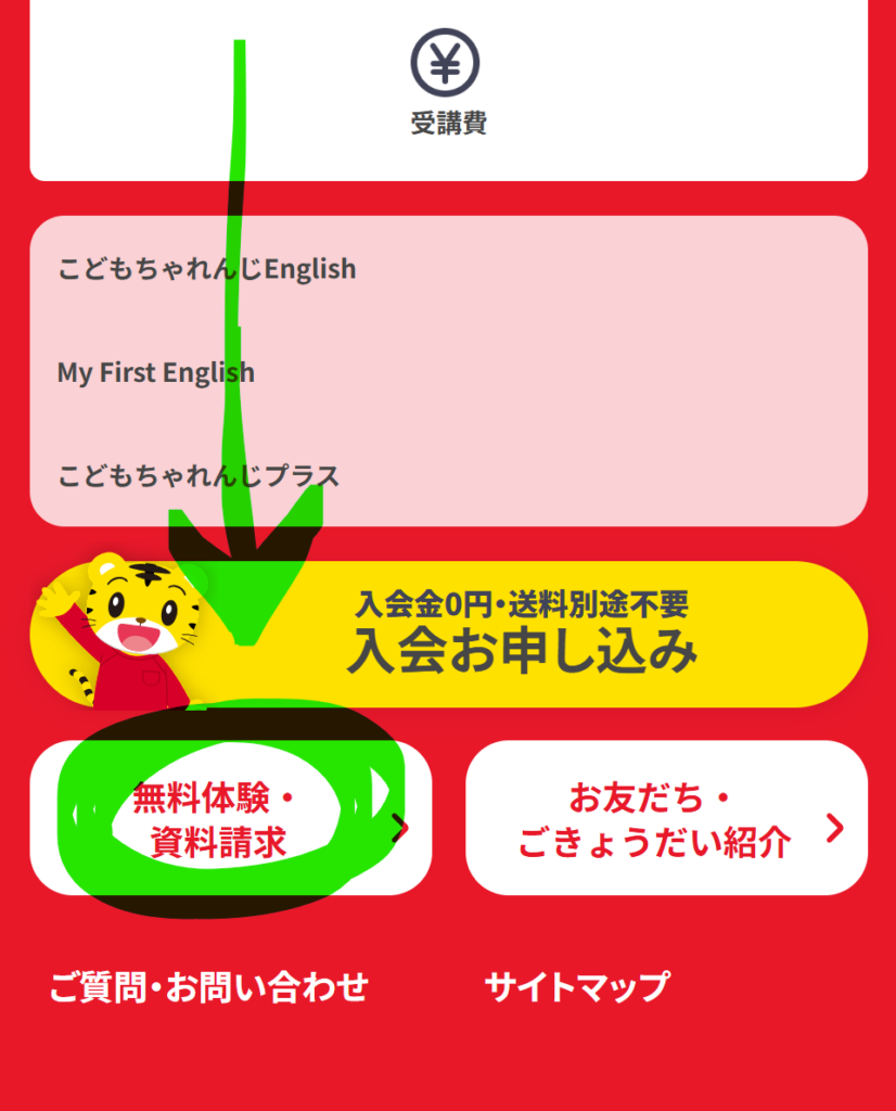 ②スクロールして「無料体験・資料請求」をタップ