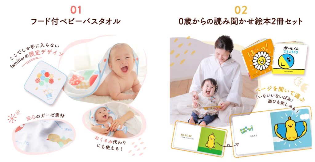 | 出産後の特典 | ファミリア バスタオル or 絵本セット |