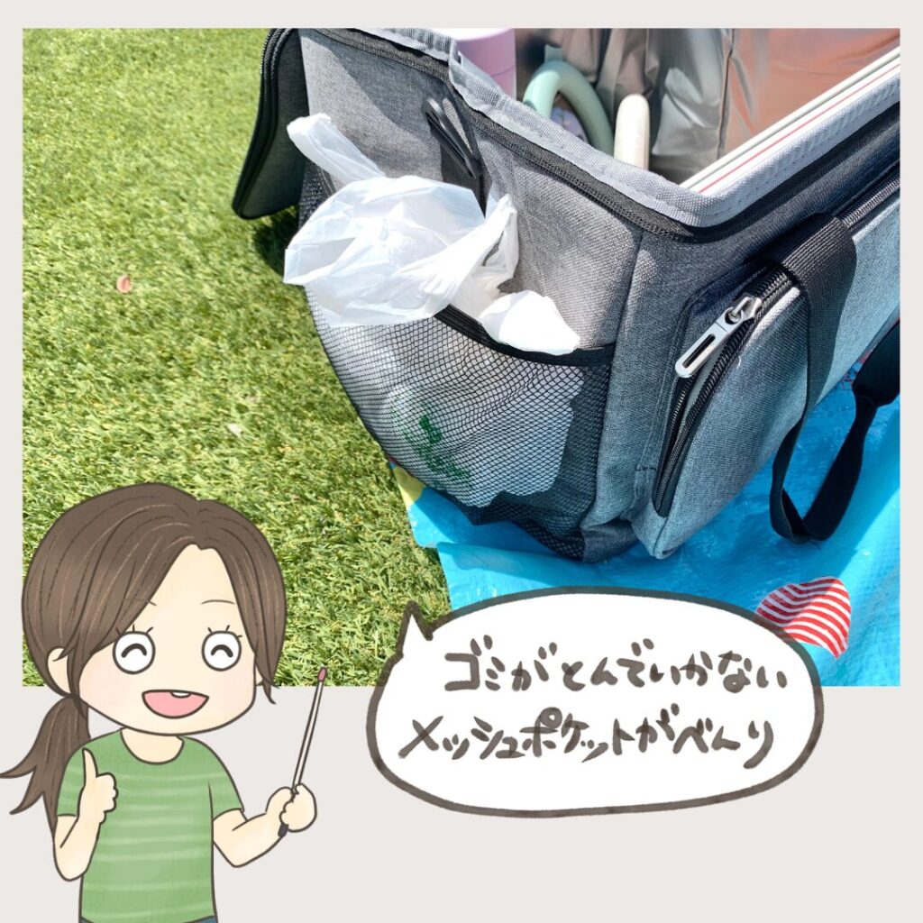メッシュポケットが付いているのでちょっとしたゴミが入れられたり、前ポケットにはウエットティッシュも入ります。