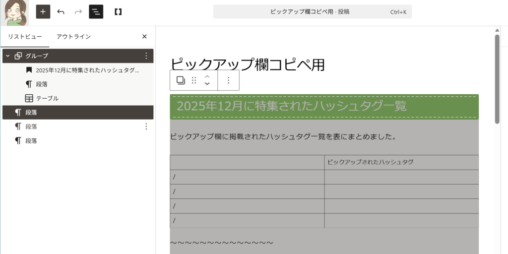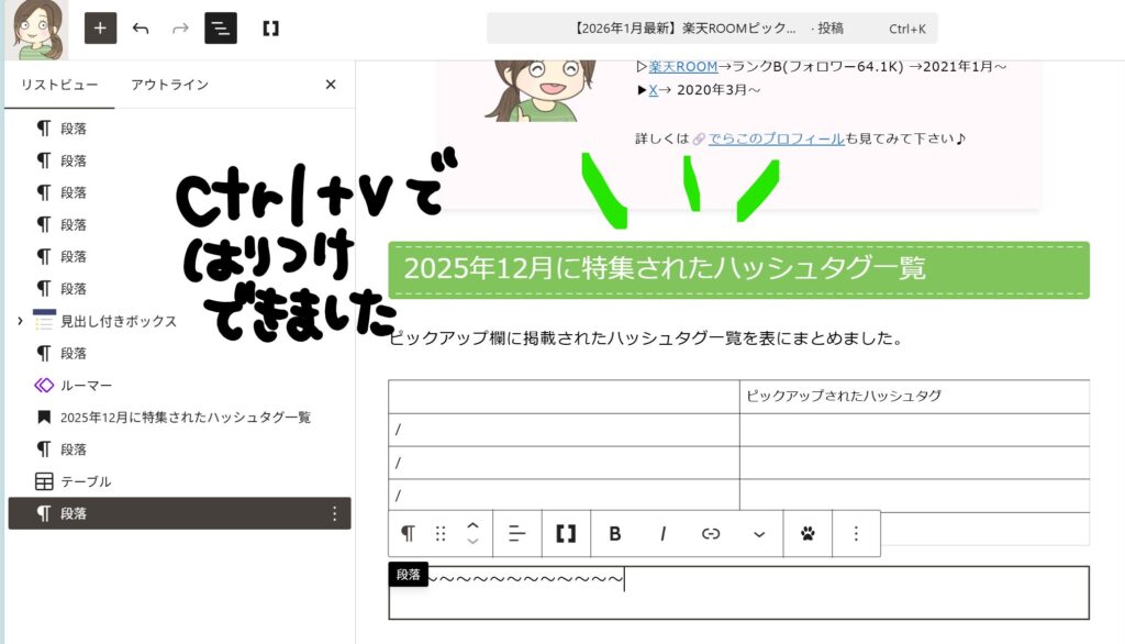 ↓次にこちらがコピペ先です。空の段落にこの表をコピーしたいんです。